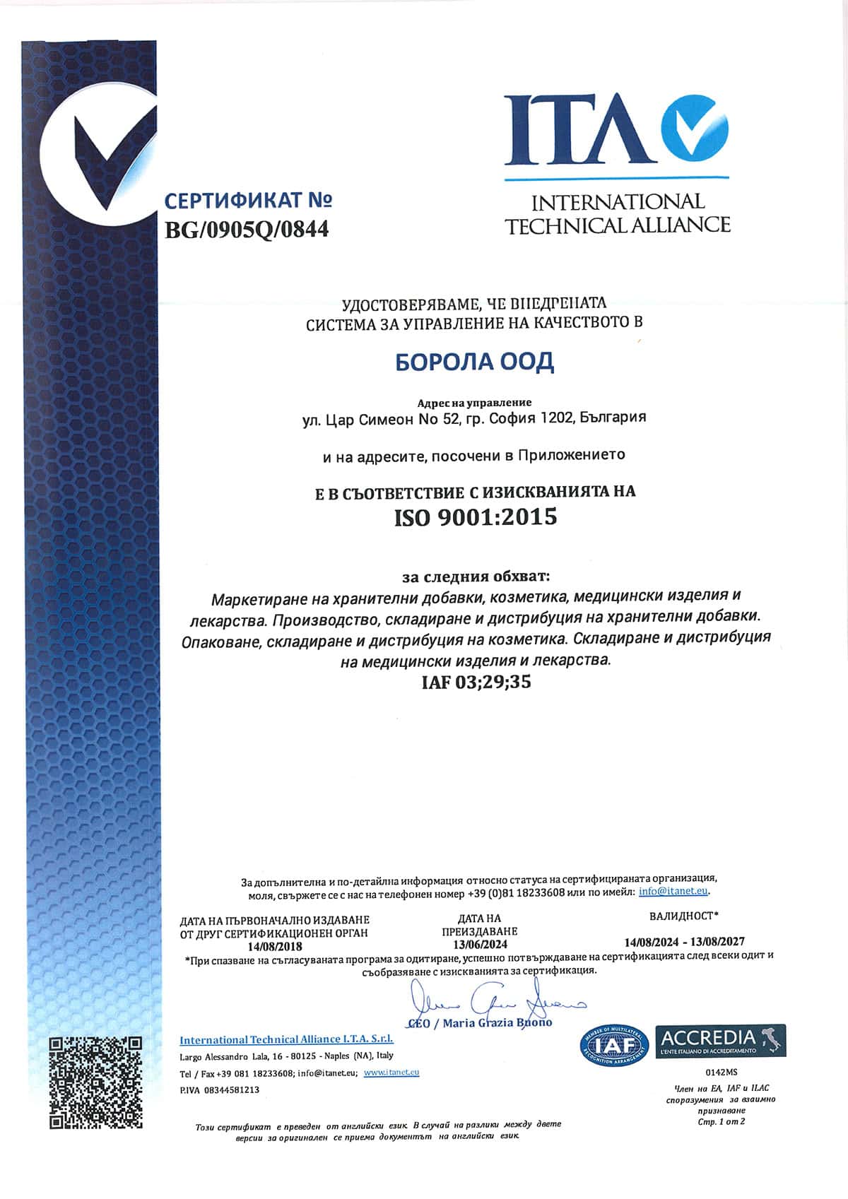 В заключение бихме искали да Ви уведомим, че в Борола ООД е разработена и внедрена интегрирана система за управление в съответствие с изискванията на международните стандарти ISO 9001:2015 и система за анализ на опасностите и контрол на критичните точки (HACCP).